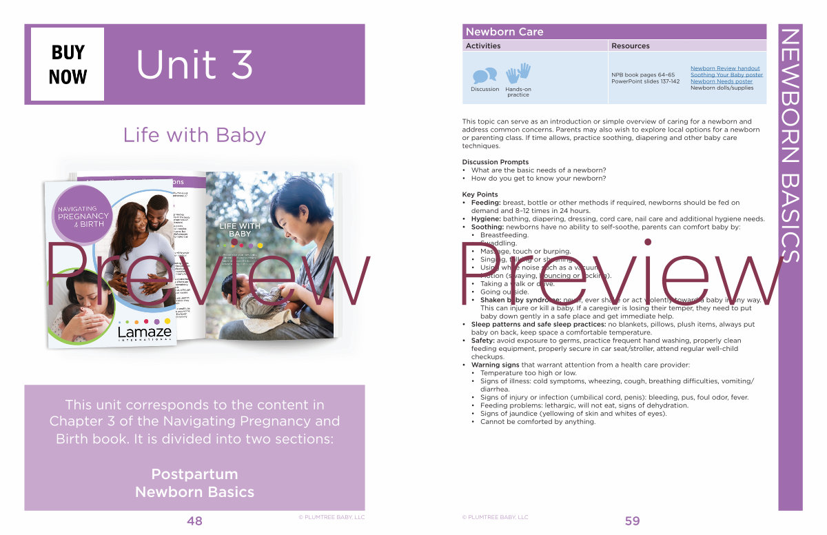 This topic can serve as an introduction or simple overview of caring for a newborn and address common concerns. Parents may also wish to explore local options for a newborn or parenting class. If time allows, practice soothing, diapering and other baby care techniques.