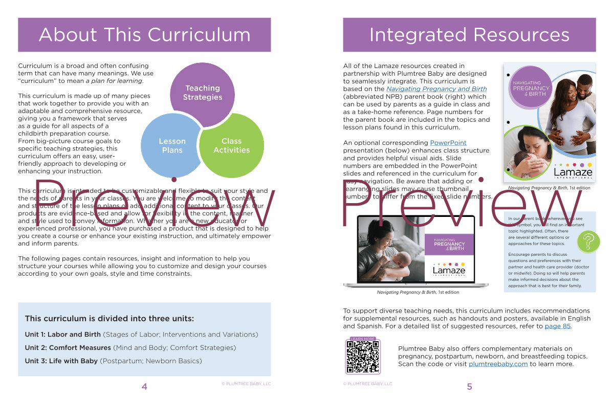 This curriculum is made up of many pieces that work together to provide you with an adaptable and comprehensive resource, giving you a framework that serves as a guide for all aspects of a childbirth preparation course. From big-picture course goals to specific teaching strategies, this curriculum offers an easy, userfriendly approach to developing or enhancing your instruction.