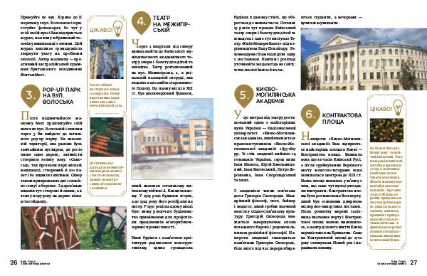 Навпроти « Києво-Могилянської академії » Вам відкриється найстаріша площа в Києві— Контрактова площа. Виникла вона ще за часів Київської Русі, а після зруйнування Верхнього мосту монголо-татарами вона залишалася центром до XIX ст. Назва площі виникла у зв ' язку з тим, що саме тут купці укладали контракти. Контрактова площа була розташована біля порту, який був основним джерелом експортно-імпортних поставок. Після розвитку мережі залізниць значення порту і Контрактової площі значно зменшилося, а центр ділового життя Києва перемістився на Хрещатик. Саме на Контрактовій площі до 1700 року святкували Новий рік і наряджали ялинку.