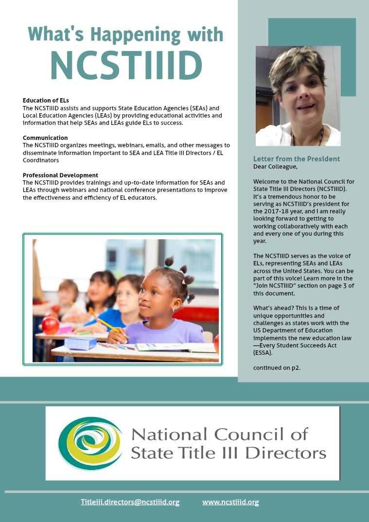 Welcome to the National Council for State Title III Directors (NCSTIIID). It’s a tremendous honor to be serving as NCSTIIID’s president for the 2017-18 year, and I am really looking forward to getting to working collaboratively with each and every one of you during this year.