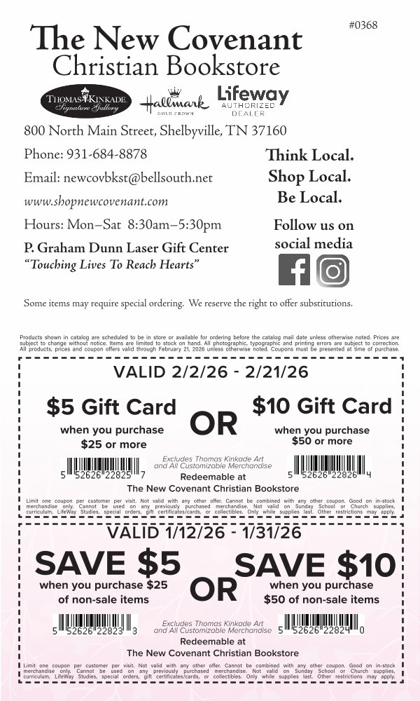 800 North Main Street, Shelbyville, TN 37160 Phone: 931-684-8878 Email: newcovbkst @ bellsouth. net www. shopnewcovenant. com