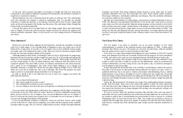 It ' s easy to see how much less metabolic resistance Dan had than Carol, and even easier to understand why they took the paths they did. If Dan had continued Induction, he would have lost his weight so quickly that it would probably have been harder for him to convert to a Lifetime Maintenance plan. If Carol had moved on to OWL, her weight loss would have slowed so radically that she might have given up in despair. It sounds to me like Dan and Carol made the right choices. Certainly they both reached their goal weight and felt enormous satisfaction in doing so.