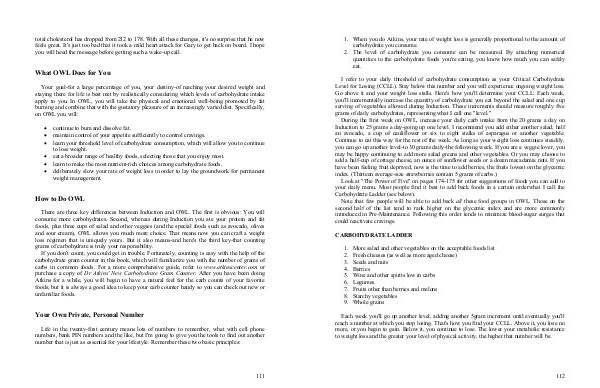 Your goal-for a large percentage of you, your destiny-of reaching your desired weight and staying there for life is best met by realistically considering which levels of carbohydrate intake apply to you. In OWL, you will take the physical and emotional well-being promoted by fat burning and combine that with the gustatory pleasure of an increasingly varied diet. Specifically, on OWL you will: