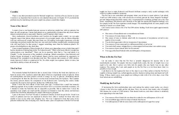 I have treated hundreds of these people-all of whom were depending on me to help them-and I had no intention of letting them down. So I asked myself, " What is the most effective weight loss eating pattern ever described?" There can be no question what that is. You read about it in Chapter 7 in the discussion of the metabolic advantage. British researchers Alan Kekwick and Gaston Pawan developed it, and Frederick Benoit and his team confirmed its superiority in burning off fat, compared to an absolute total fast. This extreme diet consists of 1,000 calories, ninety percent of which is comprised of fat. No other weight loss regimen, before or since, has matched its ability to burn off stored fat.