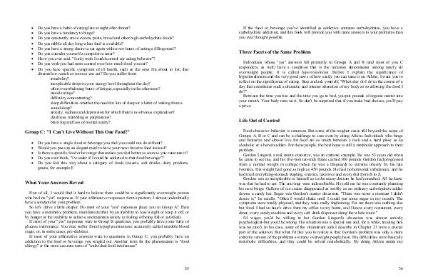 Gordon was as inexplicable to himself as to the many doctors he had consulted. All he knew was that he had to eat. The cravings were indescribable. He told me he was constantly planning his next binge. Gallons of ice cream disappeared as swiftly as an ordinary carbohydrate addict downs a candy bar. Sugar was Gordon ' s master obsession. " There was never a moment I didn ' t desire it," he recalls. " Often I would shake until I could put some sugar in my mouth. The symptoms were totally physical, and they were really frightening. For me there was nothing else but food. I had an hour ' s drive from my office to my home, and I knew every restaurant, every diner, every candy machine and every soft drink dispenser along the whole route."
