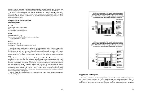 On the facing page is a sample daily menu to be followed by a person in the Induction phase. The two graphs on page 134 show that the menu, as analyzed using the most widely accepted nutritional software program, " Nutritionist V," provides the recommended daily intake of almost all vitamins and minerals.