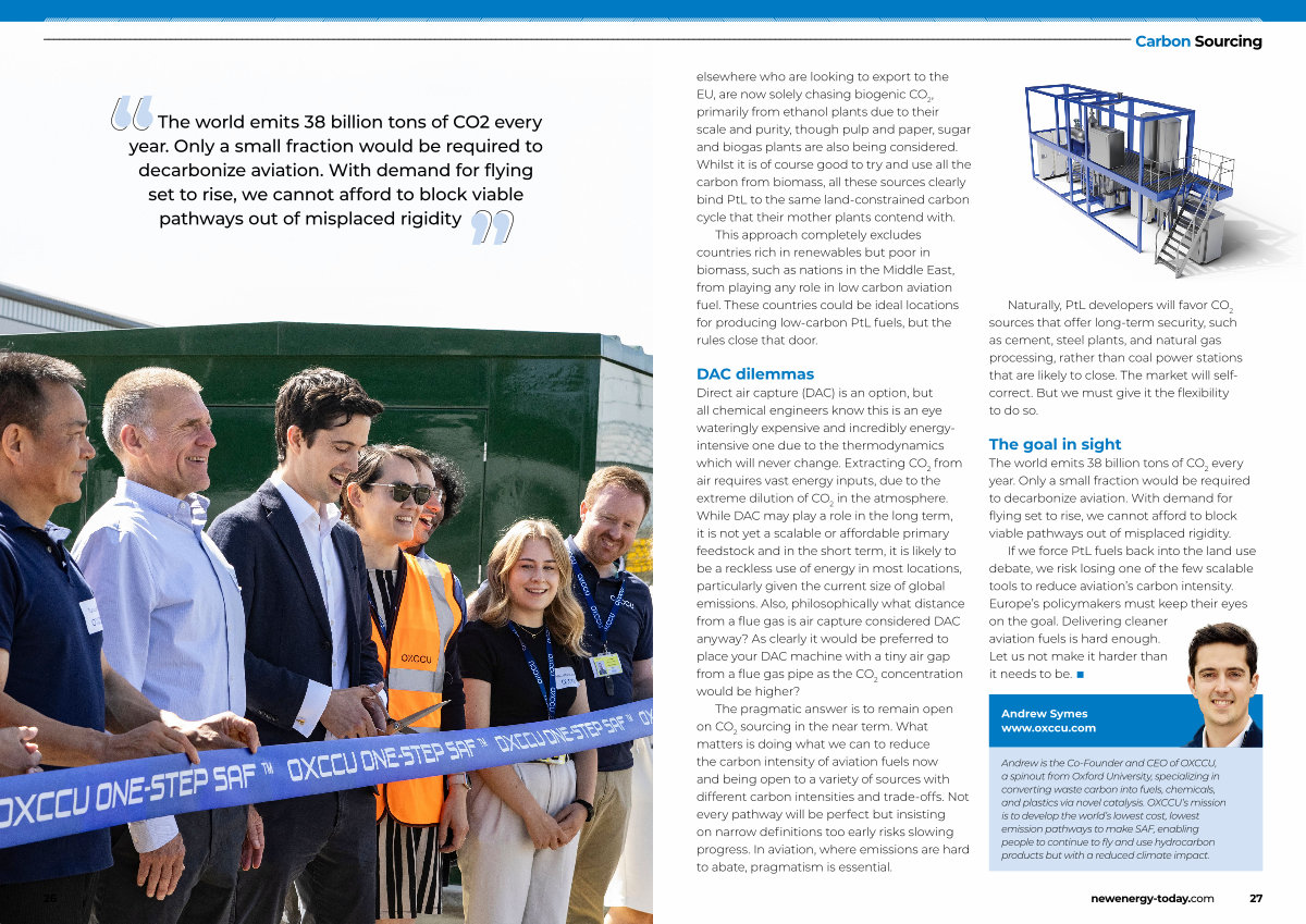 Direct air capture( DAC) is an option, but all chemical engineers know this is an eye wateringly expensive and incredibly energyintensive one due to the thermodynamics which will never change. Extracting CO 2 from air requires vast energy inputs, due to the extreme dilution of CO 2 in the atmosphere. While DAC may play a role in the long term, it is not yet a scalable or affordable primary feedstock and in the short term, it is likely to be a reckless use of energy in most locations, particularly given the current size of global emissions. Also, philosophically what distance from a flue gas is air capture considered DAC anyway? As clearly it would be preferred to place your DAC machine with a tiny air gap from a flue gas pipe as the CO 2 concentration would be higher? The pragmatic answer is to remain open on CO 2 sourcing in the near term. What matters is doing what we can to reduce the carbon intensity of aviation fuels now and being open to a variety of sources with different carbon intensities and trade-offs. Not every pathway will be perfect but insisting on narrow definitions too early risks slowing progress. In aviation, where emissions are hard to abate, pragmatism is essential.