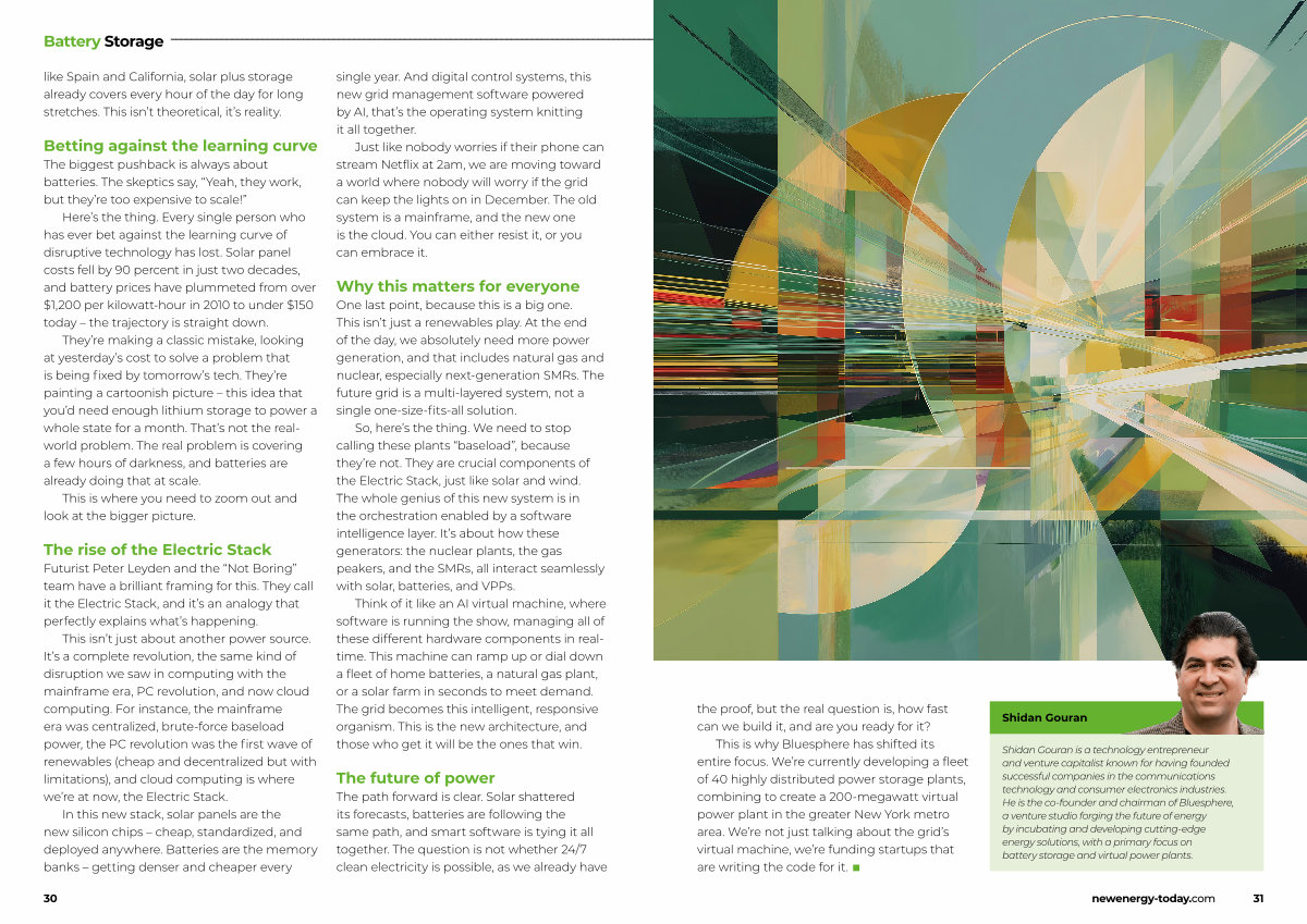 In this new stack, solar panels are the new silicon chips – cheap, standardized, and deployed anywhere. Batteries are the memory banks – getting denser and cheaper every single year. And digital control systems, this new grid management software powered by AI, that’ s the operating system knitting it all together.