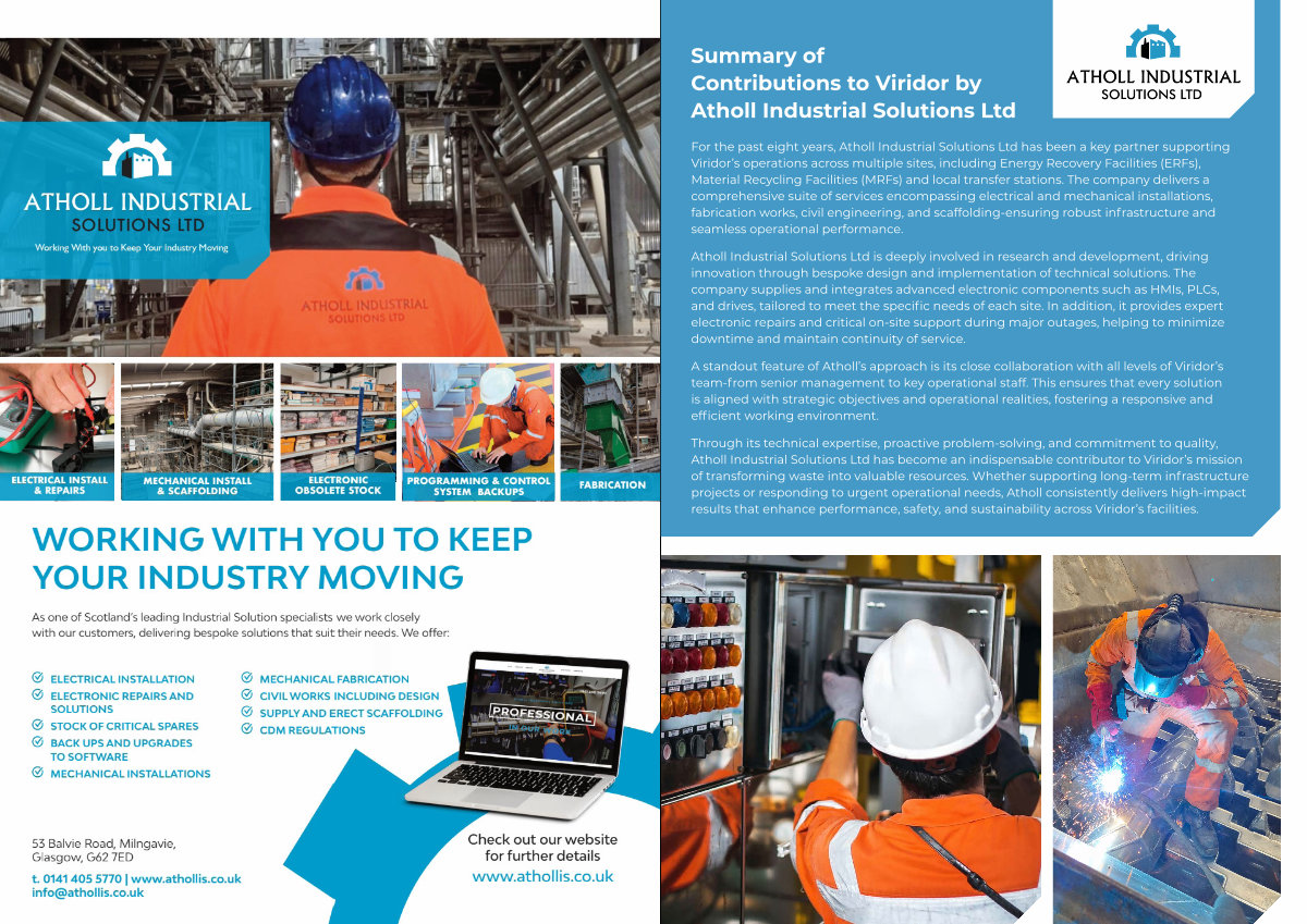 For the past eight years, Atholl Industrial Solutions Ltd has been a key partner supporting Viridor’ s operations across multiple sites, including Energy Recovery Facilities( ERFs), Material Recycling Facilities( MRFs) and local transfer stations. The company delivers a comprehensive suite of services encompassing electrical and mechanical installations, fabrication works, civil engineering, and scaffolding-ensuring robust infrastructure and seamless operational performance.