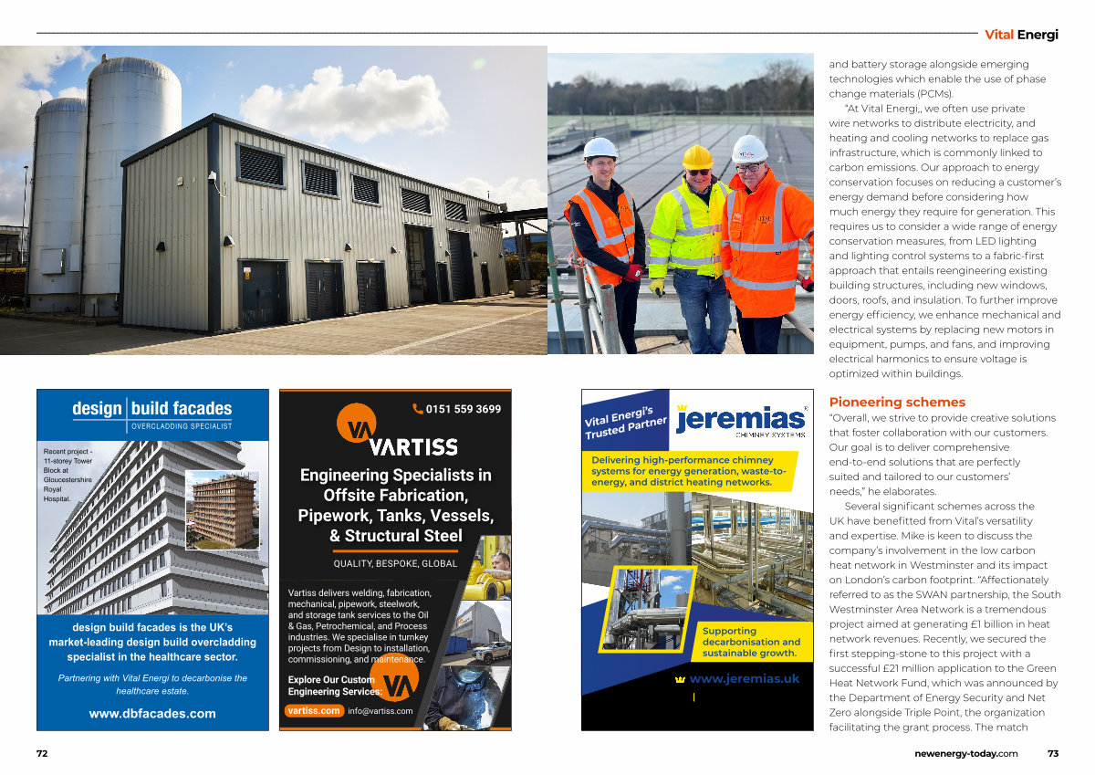 Several significant schemes across the UK have benefitted from Vital’ s versatility and expertise. Mike is keen to discuss the company’ s involvement in the low carbon heat network in Westminster and its impact on London’ s carbon footprint.“ Affectionately referred to as the SWAN partnership, the South Westminster Area Network is a tremendous project aimed at generating £ 1 billion in heat network revenues. Recently, we secured the first stepping-stone to this project with a successful £ 21 million application to the Green Heat Network Fund, which was announced by the Department of Energy Security and Net Zero alongside Triple Point, the organization facilitating the grant process. The match