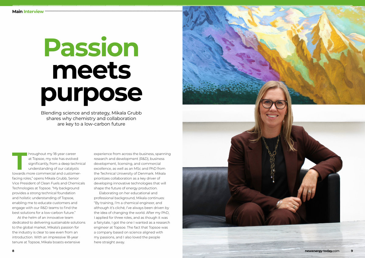 Throughout my 18-year career at Topsoe, my role has evolved significantly, from a deep technical understanding of our catalysts towards more commercial and customerfacing roles,” opens Mikala Grubb, Senior Vice President of Clean Fuels and Chemicals Technologies at Topsoe.“ My background provides a strong technical foundation and holistic understanding of Topsoe, enabling me to educate customers and engage with our R & D teams to find the best solutions for a low-carbon future.”