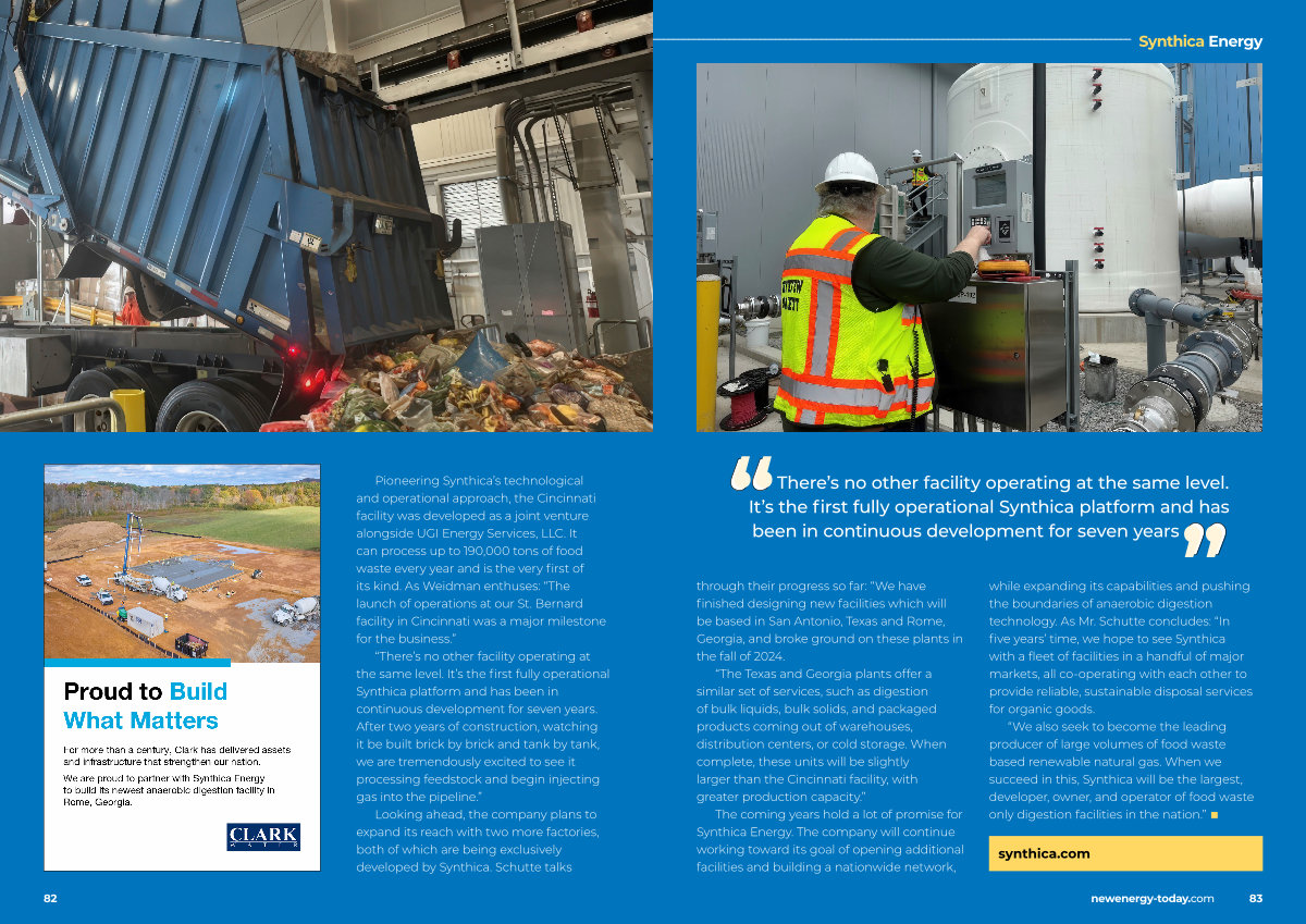 Pioneering Synthica’ s technological and operational approach, the Cincinnati facility was developed as a joint venture alongside UGI Energy Services, LLC. It can process up to 190,000 tons of food waste every year and is the very first of its kind. As Weidman enthuses:“ The launch of operations at our St. Bernard facility in Cincinnati was a major milestone for the business.”