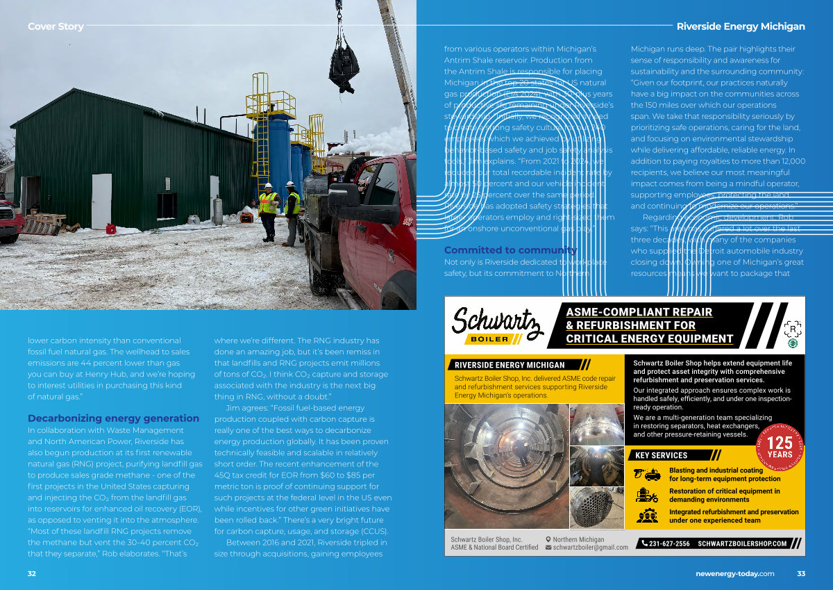In collaboration with Waste Management and North American Power, Riverside has also begun production at its first renewable natural gas( RNG) project, purifying landfill gas to produce sales grade methane- one of the first projects in the United States capturing and injecting the CO₂ from the landfill gas into reservoirs for enhanced oil recovery( EOR), as opposed to venting it into the atmosphere.“ Most of these landfill RNG projects remove the methane but vent the 30-40 percent CO₂ that they separate,” Rob elaborates.“ That’ s where we’ re different. The RNG industry has done an amazing job, but it’ s been remiss in that landfills and RNG projects emit millions of tons of CO₂. I think CO₂ capture and storage associated with the industry is the next big thing in RNG, without a doubt.”