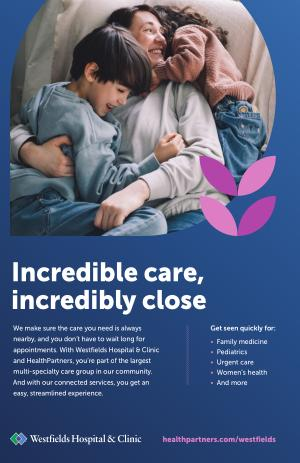 We make sure the care you need is always nearby, and you don’ t have to wait long for appointments. With Westfields Hospital & Clinic and HealthPartners, you’ re part of the largest multi-specialty care group in our community. And with our connected services, you get an easy, streamlined experience.