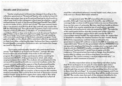 Teacher employment in Ontario has changed. According to the collective agreement an "Occasional Teacher who worked at least 90 full-time equivalent days as an Occasional Teacher for the Board in a school year shall, in the subsequent school year, be eligible to enroll and participate in each of the Insured Employee Benefit Plans [EBP] as set out under 15.2.0., 15.3.0. and 15.4.0." The new contract states that a new teacher must first work 90 days and will only acquire the EBP the following year. Throughout this magazine, I have exposed the impacts of this modification on the lives of potential teacher candidates (TC's), as they enter to become both Occasional Teacher's (OT's) and Long Term Occasional Teachers (LTO). Through speaking with soon-to-be graduates of the Ontario education program I have gained insights on the effects of this unionized collective agreement on their lives. After collecting the data, I believe that I have created a knowledgeable community of educators who can inspire the change we need for the future!