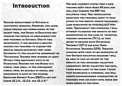 The new contract states that a new teacher must first work 90 days and will only acquire the EBP the following year. This complication questions the teachers right to have access to the mental health resources (like medication or counselling) they need. Throughout this magazine, I will attempt to expose the impacts of this modification on the lives of potential teacher candidates (TC's), as they enter to become both Occasional Teacher's (OT's) and Long Term Occasional Teachers (LTO). Through speaking with soon-to-be graduates of the Ontario education program I will be able to gain an insight on the effects of this unionized collective agreement. After collecting the data, I hope bring light to the issue. I know that knowledge is powerful, and will create knowledgeable communities of teachers who can fight until more are made aware of the issue.