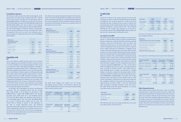 The risk that the Group ’ s customers will fail to meet their obligations , i . e . that New Wave Group ’ s accounts receivable will not be paid , constitutes a credit risk . New Wave Group has centrally adopted a risk policy and directives , based on which each company has drawn up a set of written procedures for credit control . Information from external credit reference agencies is also a stage of the process . Furthermore , companies in the Group , based on the risk policy , have the option , when needed , to insure accounts receivable which means that if the customer fails to meet its payment the company will be reimbursed by the insurance company . The credit risk in the Corporate operating segment is lower , as the resellers , which are New Wave Group ’ s customers , make purchases based on orders that have already been placed by the end customers . The resellers are relatively small and large in number . In 2021 confirmed credit losses in Corporate represented 0.08 ( 0.12 ) % of sales . In the Gifts & Home Furnishings and Sports & Leisure operating segments sales are made to selected resellers , and credit losses are small , although there is a higher concentration to a smaller number of customers compared to the promo market . In 2021 confirmed credit losses in these two operating segments represented 0.10 ( 0.39 ) % and 0.03 ( 0.38 ) % of net sales . The Group ' s customers have been affected by the negative effects of the COVID-19 pandemic , which has led to an increased credit risk . The companies within the Group attach great importance to monitoring the customers ' ability to pay and continuously make assessments regarding adequate credit risk reserve . The table below shows the aging distribution of accounts receivable and the credit risk reserve .