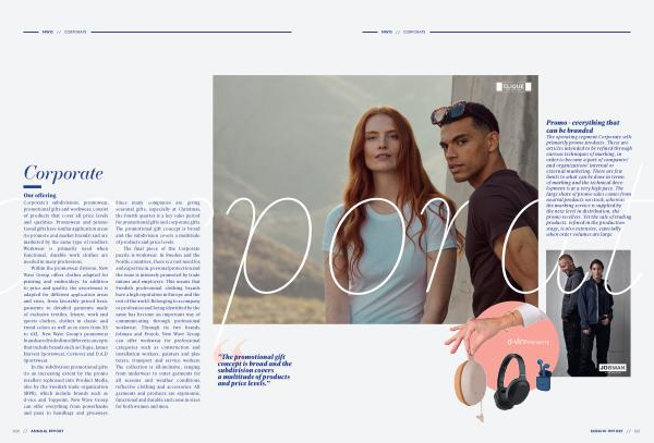 Corporate ’ s subdivisions , promowear , promotional gifts and workwear , consist of products that cover all price levels and qualities . Promowear and promotional gifts have similar application areas ( to promote and market brands ) and are marketed by the same type of resellers . Workwear is primarily used when functional , durable work clothes are needed in many professions .