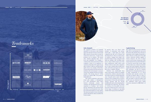 The capital tied up in stock is relatively high , but is a prerequisite for success in the promo sales channel . The customer is dependent on the supplier being able to deliver full size sorting and in the right colours , otherwise another supplier is chosen . However , the risk of obsolescence is low because a larger part of the range is timeless basic products that there is a need for season after season . Many of the products are common to both the promo and retail channels , which offers significant risk diversification and means that catalogues can also be common . Adjustment for changed purchase prices is made continuously as it is about immediate sales and the currency risk can thus be limited . When it comes to capital tied up in accounts receivable , sales are made to selected retailers and credit losses are relatively low . In 2021 , the confirmed credit losses within Corporate amounted to 0.08 ( 0.12 ) % of sales .