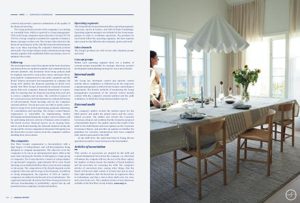 New Wave Group ’ s organization is decentralized , with a high degree of independence and self-determination being delegated to company management . The objective is for the companies to be run in an entrepreneurial spirit , while at the same time enjoying the benefits of belonging to a large group of companies . The Group therefore consists of a large number of operational companies , approximately 65 in total . Board meetings are normally held three times a year in each company or sub-group . The composition of the Boards depends on the company ’ s direction and its stage of development . In addition to Group management , the expertise of CEOs in “ mature ” companies are utilized in the Boards of local subsidiaries . The organizational model chosen by New Wave Group provides for effective benchmarking of profitability , capital tied up and growth between companies , brands and markets .