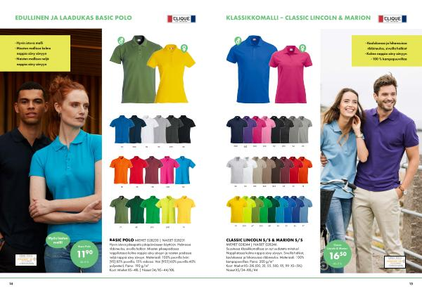 BASIC POLO MIEHET 028230 | NAISET 028231 Hyvin istuva pikeepaita jokapäiväiseen käyttöön . Helmassa ribbineulos , sivuilla halkiot . Miesten pikeepaidassa nappilistassa kolme nappia sävy sävyyn ja naisten paidassa neljä nappia sävy sävyyn . Materiaali : 100 % puuvilla ( väri [ 95 ] 85 % puuvilla , 15 % viskoosi . Väri [ 955 ] 60 % puuvilla 40 % polyesteri ). Paino : 190 g / m 2 Koot : Miehet XS – 4XL | Naiset 34 / XS – 44 / XXL |