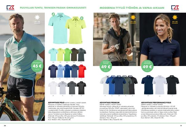 MIEHET 354420 | NAISET 354421 Advantage Premium -pikeepaita on valmistettu pehmeästä ja joustavasta CB DryTec + 35UPF -materiaalista , joka siirtää kosteutta iholta . Ainutlaatuinen sekoitemateriaali tekee paidasta monikäyttöisen . Kauluksen sisäpuolella kontrastiväristä kudottua materiaalia pienenä tyylikkäänä yksityiskohtana . Nappilistassa metallinapit . Materiaali : 52 % puuvillaa , 45 % polyesteriä ja 3 % elastaania . Paino : 190 g / m 2 Koot : Miehet S – 4XL | Naiset XS – XXL