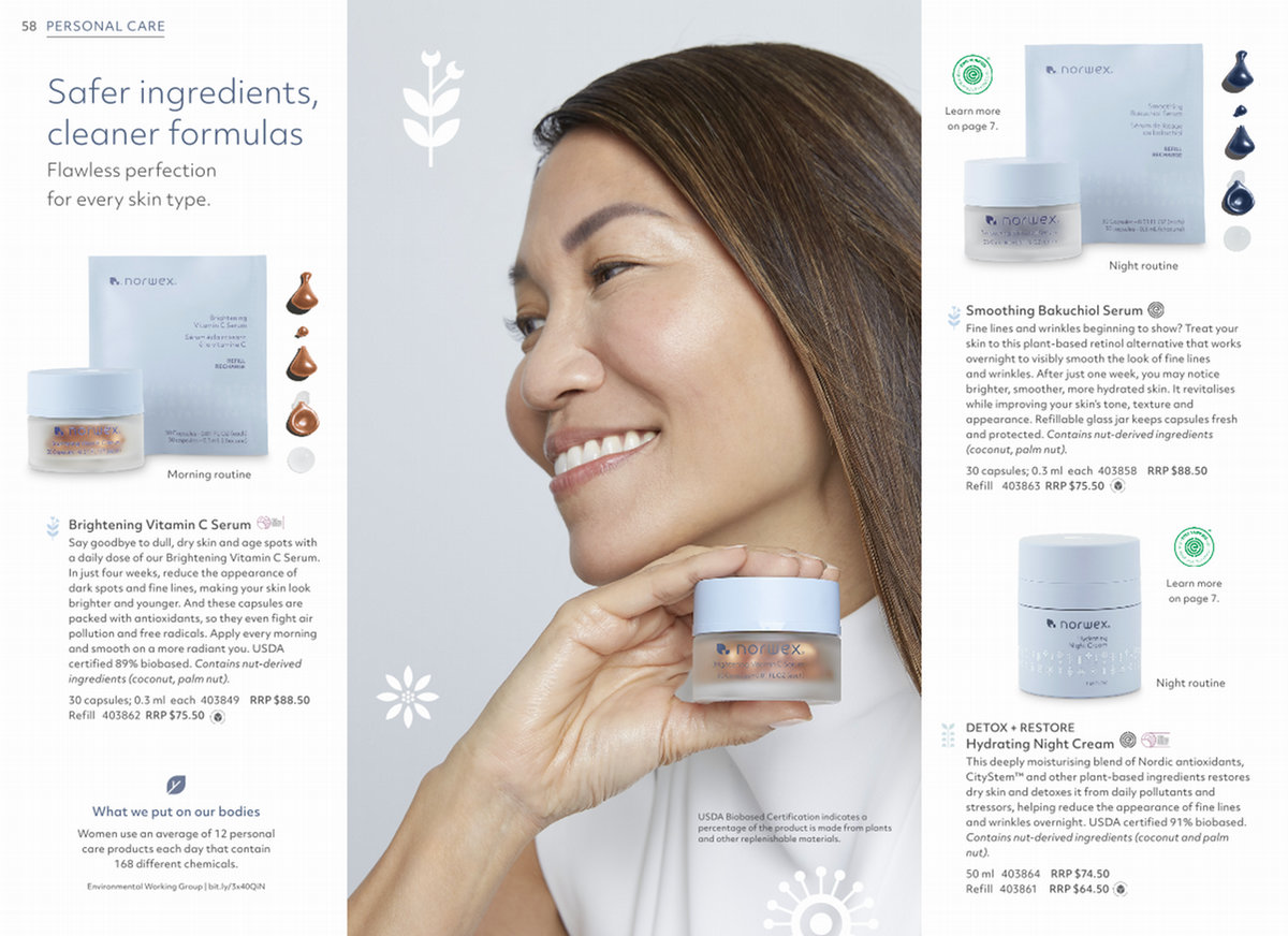 dark spots and fine lines, making your skin look brighter and younger. And these capsules are packed with antioxidants, so they even fight air pollution and free radicals. Apply every morning and smooth on a more radiant you. USDA certified 89 % biobased. Contains nut-derived ingredients( coconut, palm nut).