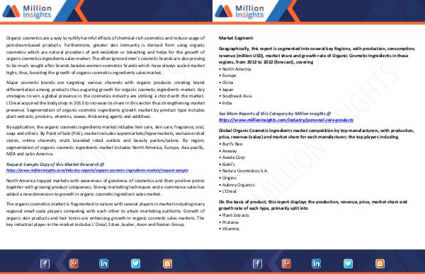 Geographically, this report is segmented into several key Regions, with production, consumption, revenue( million USD), market share and growth rate of Organic Cosmetic Ingredients in these regions, from 2012 to 2022( forecast), covering