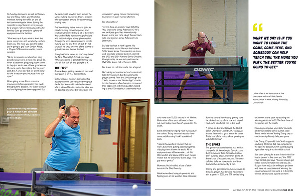 John Allen is an instructor at the Southern Indiana Table Tennis Association in New Albany. Photo by Joe Ullrich sold more than 75,000 rackets in his lifetime. Aficionados of the sport still search them out even today, more than 25 years after his death.