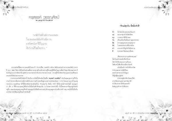 วารสารมาแตร์เดอีนิวส์ฉบับนี้ นับเป็นการเปิดพื้นที่คอลัมน์ใหม่ชื ่อ“ ครุสรรค์ วรรณศิลป์” สำาหรับคุณครูทุกท่านที่รักใน งานกวี สามารถสื่อสารความรู้ความคิดจินตนาการสร้างสรรค์ในรูปแบบคำาประพันธ์ฉบับละ 1 ท่าน โดยผลงานแรกนี้ คุณครู กนกพรรณ ศุภเสรีสกุล ได้ให้เกียรติส่งคำาประพันธ์เรื่อง“ รักแม่ทุกวัน ยึดมั่น ทำาดี” ซึ่งที่มาของคำาประพันธ์นี้ คุณครูเล่า ว่า เมื่อ 2 ปีที่ผ่านมาคุณครูได้ล้มป่วยถึงขั้นต้องเข้าห้องฉุกเฉิน ณ โรงพยาบาลแห่งหนึ่ง ทั้งนี้ตลอดเวลาที่คุณครูรักษาตัว อยู่นั้น คุณแม่ของคุณครูจะอยู่เคียงข้างคอยดูแลใกล้ชิดด้วยความห่วงใยจนคุณครูหายป่วยเป็นปรกติ เหตุการณ์ครั้งนั้นจึงเป็น แรงบันดาลใจให้คุณครูเขียนคำาประพันธ์นี้