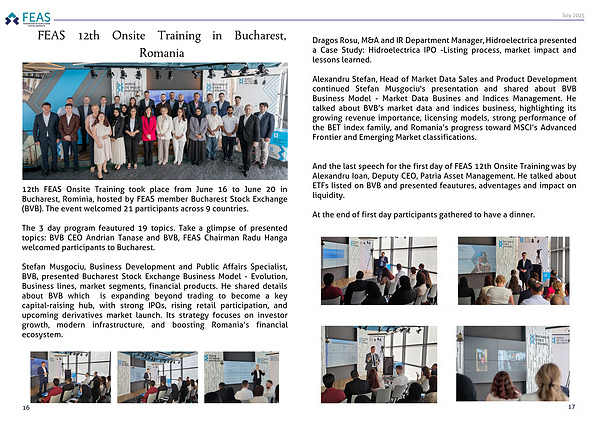 12th FEAS Onsite Training took place from June 16 to June 20 in Bucharest, Rominia, hosted by FEAS member Bucharest Stock Exchange (BVB). The event welcomed 21 participants across 9 countries.