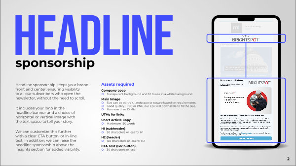Headline sponsorship keeps your brand front and center, ensuring visibility to all our subscribers who open the newsletter, without the need to scroll.
