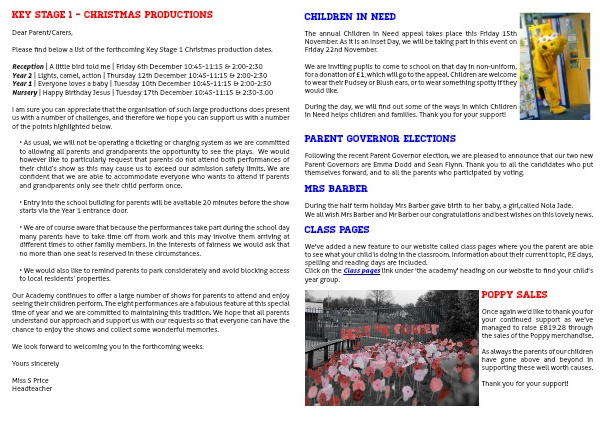 Please find below a list of the forthcoming Key Stage 1 Christmas production dates.