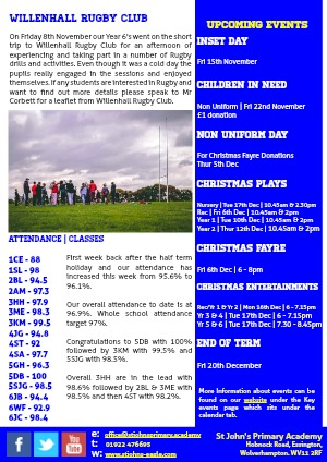 On Friday 8th November our Year 6's went on the short trip to Willenhall Rugby Club for an afternoon of experiencing and taking part in a number of Rugby drills and activities. Even though it was a cold day the pupils really engaged in the sessions and enjoyed themselves. If any students are interested in Rugby and want to find out more details please speak to Mr Corbett for a leaflet from Willenhall Rugby Club.