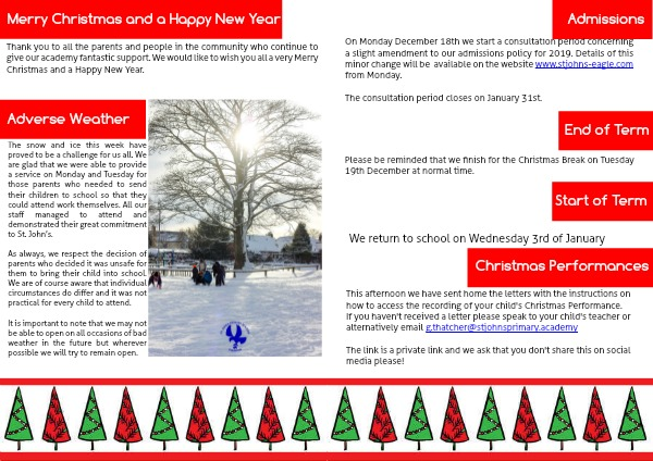 The snow and ice this week have proved to be a challenge for us all. We are glad that we were able to provide a service on Monday and Tuesday for those parents who needed to send their children to school so that they could attend work themselves. All our staff managed to attend and demonstrated their great commitment to St. John’s.