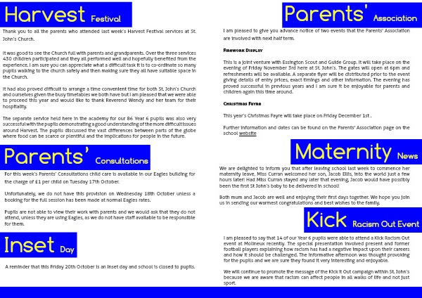 Thank you to all the parents who attended last week’s Harvest Festival services at St. John’s Church.