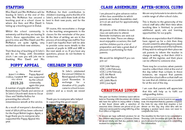 Their final day of teaching at St John’s will be on Friday 20th December 2019. I am sure you will join me in thanking Miss Elwell and Mrs McMahon for their contribution to children’s learning, and to the life of St John’s, and to wish them both all the best in their new posts, and for the future.