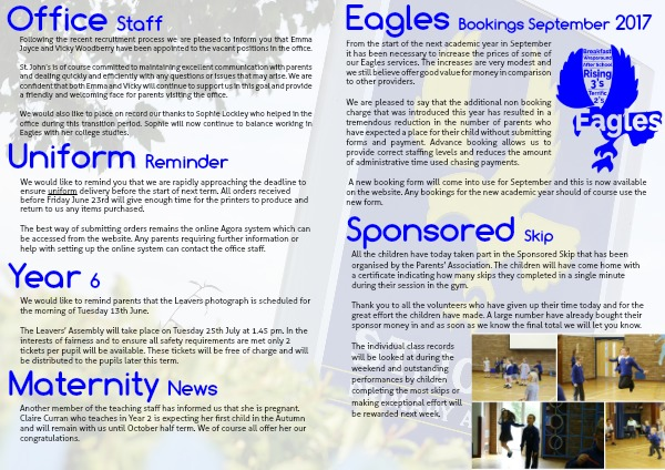 From the start of the next academic year in September it has been necessary to increase the prices of some of our Eagles services. The increases are very modest and we still believe offer good value for money in comparison to other providers.
