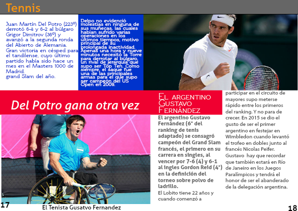 Juan Martín Del Potro (223º) derrotó 6-4 y 6-2 al búlgaro Grigor Dimitrov (36º) y avanzó a la segunda ronda del Abierto de Alemania. Gran victoria en césped para el tandilense, cuyo último partido había sido hace un mes en el Masters 1000 de Madrid.