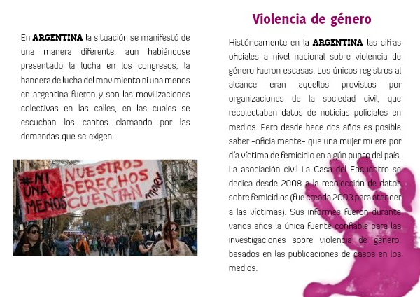 Históricamente en la ARGENTINA las cifras oficiales a nivel nacional sobre violencia de género fueron escasas. Los únicos registros al alcance eran aquellos provistos por organizaciones de la sociedad civil, que recolectaban datos de noticias policiales en medios. Pero desde hace dos años es posible saber -oficialmente- que una mujer muere por día víctima de femicidio en algún punto del país.
