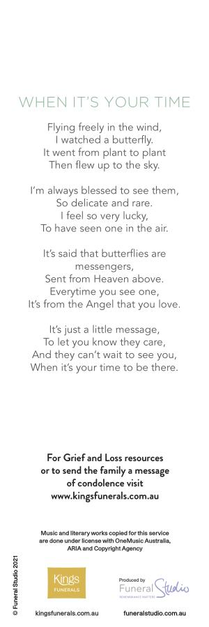 For Grief and Loss resources or to send the family a message of condolence visit www . kingsfunerals . com . au