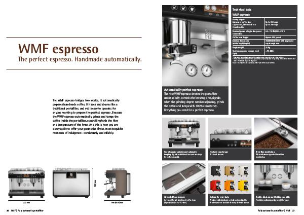 Automatically perfect espresso The new WMF espresso detects the portafilter automatically, controls the brewing time, signals when the grinding degree needs readjusting, grinds the coffee and tamps with 100 % consistency. Everything you need for a perfect espresso.