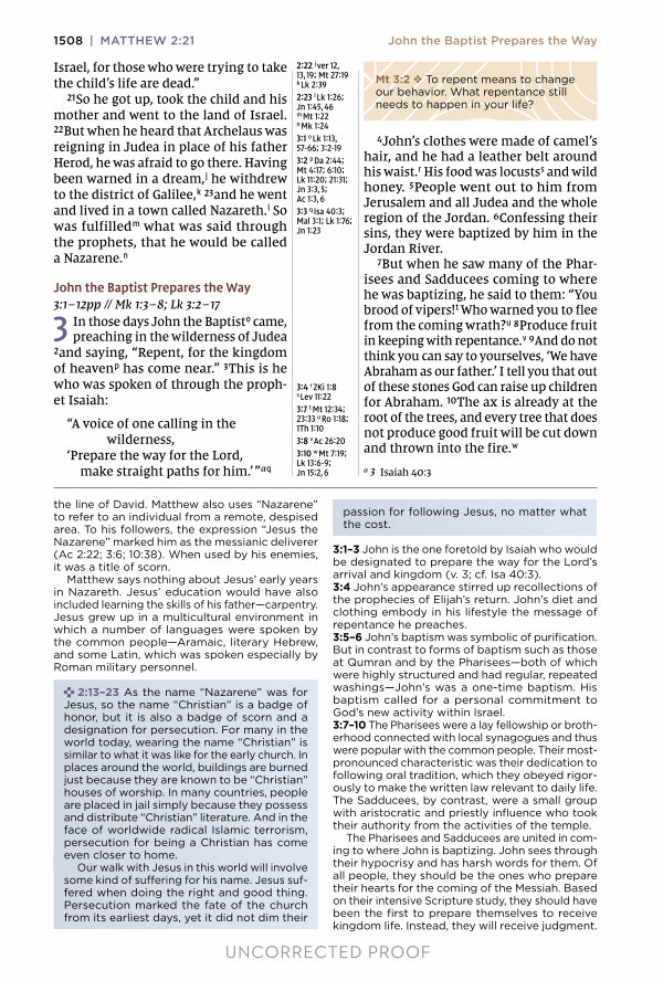 In those days John the Bap tist o came, preach ing in the wil der ness of Ju dea 2 and say ing,“ Re pent, for the king dom of heav en p has come near.” 3 This is he who was spo ken of through the prophet Isa iah: