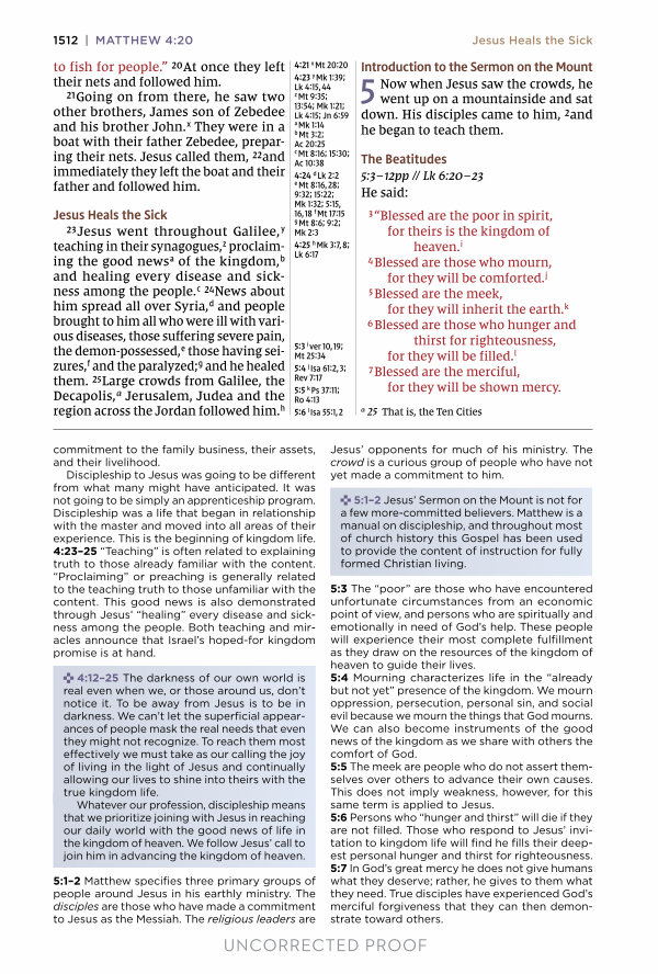 5:3 The“ poor” are those who have encountered unfortunate circumstances from an economic point of view, and persons who are spiritually and emotionally in need of God’ s help. These people will experience their most complete fulfillment as they draw on the resources of the kingdom of heaven to guide their lives. 5:4 Mourning characterizes life in the“ already but not yet” presence of the kingdom. We mourn oppression, persecution, personal sin, and social evil because we mourn the things that God mourns. We can also become instruments of the good news of the kingdom as we share with others the comfort of God. 5:5 The meek are people who do not assert themselves over others to advance their own causes. This does not imply weakness, however, for this same term is applied to Jesus. 5:6 Persons who“ hunger and thirst” will die if they are not filled. Those who respond to Jesus’ invitation to kingdom life will find he fills their deepest personal hunger and thirst for righteousness. 5:7 In God’ s great mercy he does not give humans what they deserve; rather, he gives to them what they need. True disciples have experienced God’ s merciful forgiveness that they can then demonstrate toward others.