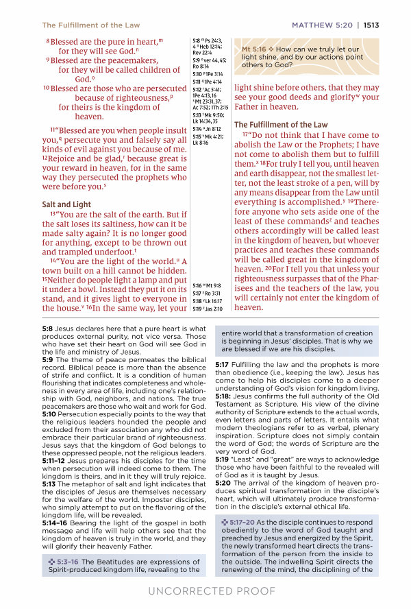 5:8 Jesus declares here that a pure heart is what produces external purity, not vice versa. Those who have set their heart on God will see God in the life and ministry of Jesus. 5:9 The theme of peace permeates the biblical record. Biblical peace is more than the absence of strife and conflict. It is a condition of human flourishing that indicates completeness and wholeness in every area of life, including one’ s relationship with God, neighbors, and nations. The true peacemakers are those who wait and work for God. 5:10 Persecution especially points to the way that the religious leaders hounded the people and excluded from their association any who did not embrace their particular brand of righteousness. Jesus says that the kingdom of God belongs to these oppressed people, not the religious leaders. 5:11 – 12 Jesus prepares his disciples for the time when persecution will indeed come to them. The kingdom is theirs, and in it they will truly rejoice. 5:13 The metaphor of salt and light indicates that the disciples of Jesus are themselves necessary for the welfare of the world. Imposter disciples, who simply attempt to put on the flavoring of the kingdom life, will be revealed. 5:14 – 16 Bearing the light of the gospel in both message and life will help others see that the kingdom of heaven is truly in the world, and they will glorify their heavenly Father.
