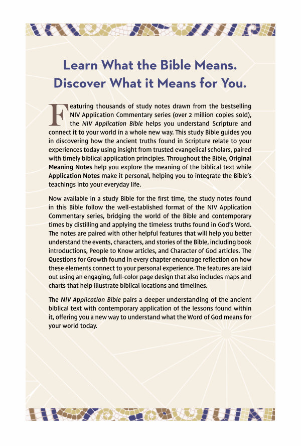 Featuring thousands of study notes drawn from the bestselling NIV Application Commentary series( over 2 million copies sold), the NIV Application Bible helps you understand Scripture and connect it to your world in a whole new way. This study Bible guides you in discovering how the ancient truths found in Scripture relate to your experiences today using insight from trusted evangelical scholars, paired with timely biblical application principles. Throughout the Bible, Original Meaning Notes help you explore the meaning of the biblical text while Application Notes make it personal, helping you to integrate the Bible’ s teachings into your everyday life.
