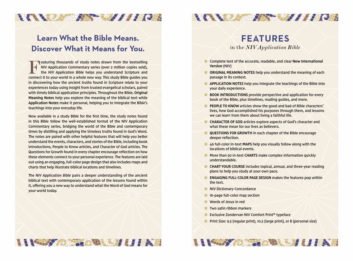 The NIV Application Bible pairs a deeper understanding of the ancient biblical text with contemporary application of the lessons found within it, offering you a new way to understand what the Word of God means for your world today.