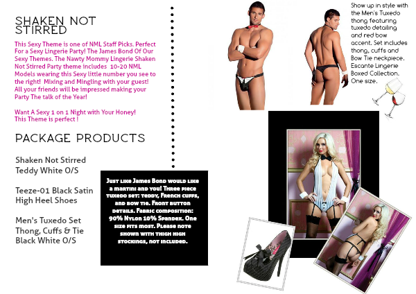 Show up in style with the Men's Tuxedo thong featuring tuxedo detailing and red bow accent. Set includes thong, cuffs and Bow Tie neckpiece. Escante Lingerie Boxed Collection. One size.