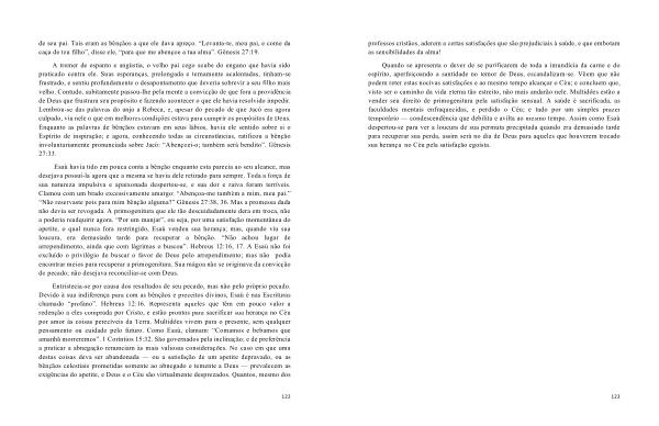 Entristecia-se por causa dos resultados de seu pecado , mas não pelo próprio pecado . Devido à sua indiferença para com as bênçãos e preceitos divinos , Esaú é nas Escrituras chamado “ profano ”. Hebreus 12:16 . Representa aqueles que têm em pouco valor a redenção a eles comprada por Cristo , e estão prontos para sacrificar sua herança no Céu por amor às coisas perecíveis da Terra . Multidões vivem para o presente , sem qualquer pensamento ou cuidado pelo futuro . Como Esaú , clamam : “ Comamos e bebamos que amanhã morreremos ”. 1 Coríntios 15:32 . São governados pela inclinação ; e de preferência a praticar a abnegação renunciam às mais valiosas considerações . No caso em que uma destas coisas deva ser abandonada — ou a satisfação de um apetite depravado , ou as bênçãos celestiais prometidas somente ao abnegado e temente a Deus — prevalecem as exigências do apetite , e Deus e o Céu são virtualmente desprezados . Quantos , mesmo dos