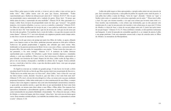 Os fugitivos estavam na verdade em grande perigo . O não haver ele levado a efeito seu plano hostil foi devido ao fato de que Deus mesmo interviera em proteção de Seu servo . “ Poder havia em minha mão para vos fazer mal ”, disse Labão , “ mas o Deus de vosso pai me falou ontem à noite , dizendo : Guarda-te , que não fales a Jacó nem bem nem mal ” ( Gênesis 31:29 ); isto é , ele não deveria obrigá-lo a voltar , ou instar com o mesmo , mediante propostas lisonjeiras . Labão tinha retido para si o dote matrimonial de suas filhas , e sempre tratara a Jacó com engano e aspereza ; mas com uma dissimulação característica censurouo agora pela sua partida secreta , a qual não dera ao pai oportunidade de fazer uma festa para a partida , ou mesmo para dizer adeus a suas filhas e filhos delas . Em resposta Jacó apresentou claramente o procedimento egoísta e ambicioso de Labão , e apelou para ele como testemunha de sua própria fidelidade e honestidade . “ Se o Deus de meu pai , o Deus de Abraão , e o temor de Isaque , não fora comigo ”, disse Jacó , “ por certo me enviarias agora vazio . Deus atendeu a minha aflição , e ao trabalho das minhas mãos , e repreendeu-te ontem à noite ”. Gênesis 31:42 .